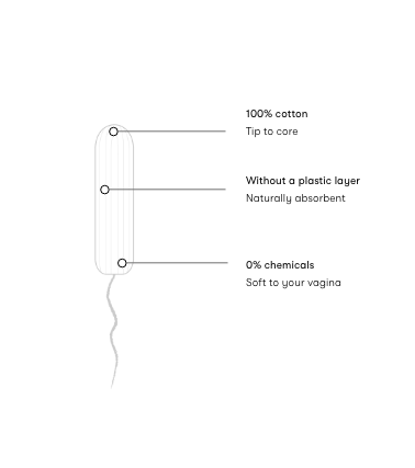Made from 100% cotton, tip to core, our tampons are naturally absorbent and hypoallergenic. Ideal for a light period flow, they keep you free from vaginal irritation (like an itchy or burning feeling) and leaks.