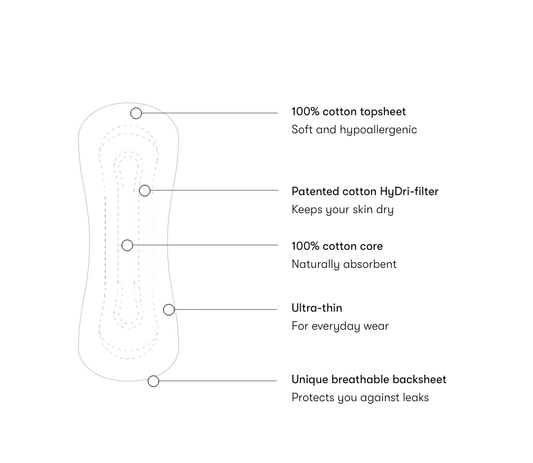 Our oh-so-soft, 100% cotton panty liners naturally protect you against leaks – while giving your vulval skin room to breathe. Absorbent and with a comfortable, barely-there fit, they’re perfect for everyday discharge or a light flow.