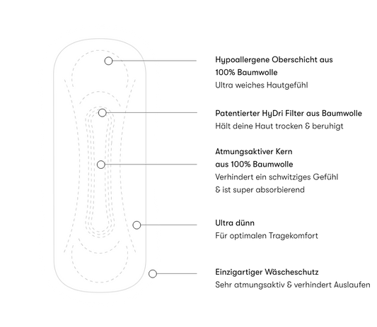 Unsere superweichen Binden aus 100% Baumwolle bieten dir während deiner Menstruation zuverlässigen Schutz – vor Auslaufen, Juckreiz, Ausschlag und Reizungen der Vulvahaut. Mit ihrer ultradünnen Passform und der natürlichen Saugfähigkeit sorgen sie für maximalen Komfort.