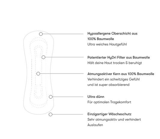 Unsere ultraweichen Slipeinlagen aus 100% Baumwolle lassen deine Vulvahaut atmen. Sie sind von Natur aus saugfähig und bieten dank ihrer dünnen Passform optimalen Tragekomfort. Perfekt für täglichen Ausfluss oder die letzten Tage deiner Menstruation.